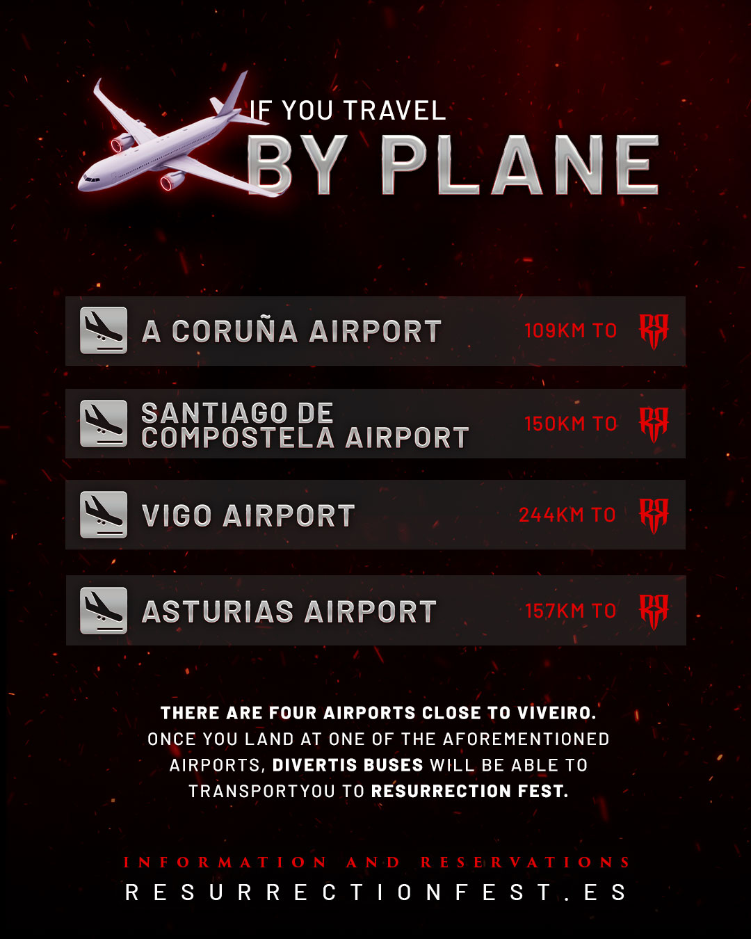 El Resurrection Fest tiene un porcentaje importante de asistentes de Portugal, Francia, Alemania, UK y otros países. Para ellos, la opción más práctica suele ser volar a Madrid o Barcelona y desde ahí combinar avión interno + coche de alquiler, o tomar el tren Alvia hasta Lugo y completar en autobús.